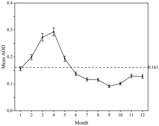- From 2009 to 2019, AOD in Gansu Province ranged between 0.119 and 0.185, showing an overall slow decreasing trend. Spring AOD was generally higher than in other seasons, but its decreasing trend was also the most pronounced. Monthly mean AOD fluctuated between 0.091 and 0.293, exhibiting a “unimodal” variation pattern.
