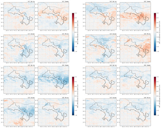 Figure 9(a1,b1,c1,d1) show that in spring, AOD and PBLH exhibit a weak negative correlation over most of the province, with a weak positive correlation in the Qilian Mountains and western Gannan Plateau. In the Hexi Corridor, strong westerly winds and dry surfaces cause elevated PBLH to accelerate vertical dispersion of dust, thereby diluting aerosols. Conversely, in the Qilian Mountains and western Gannan Plateau, changes in surface albedo during snowmelt increase sensible heat flux, leading to local thermal uplift that retains dust [29]. In summer, the correlation shifts to positive over large areas (significantly so in the eastern tip of the Hexi Corridor and eastern Hedong), potentially due to the radiative effects of light-absorbing aerosols emitted from urban clusters in Hedong during summer, which suppress boundary layer development, forming a positive feedback loop [30]. Meanwhile, the Qilian Mountains and southwestern Gannan Plateau maintain a negative correlation due to weakened convection associated with lower temperatures. In autumn, negative correlation prevails in Hedong, Gannan Plateau, and northern Hexi Corridor, while the Qilian Mountains show weak positive correlation. Winter is characterized by weak negative correlation over most areas, with stronger negative correlation in the central Hexi Corridor, possibly related to basin topography enhancing temperature inversions, where compressed PBLH couples with heating emissions [31].