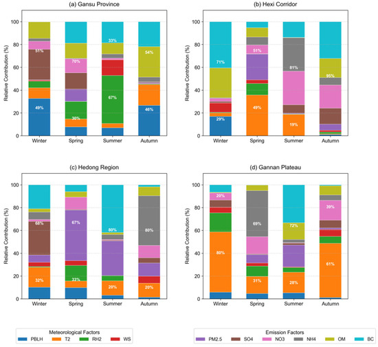 - In 80% of seasonal scenarios (13 out of 16), emission factors (PM2.5, , , , OM, and BC) contributed over 50% to AOD. Emissions dominated year-round in the Hexi Corridor (71% to 95%) and Hedong region (68% to 80%), and in spring (69%) and summer (72%) on the Gannan Plateau. Regarding component contributions, BC contributed over 30% in 11 seasons (e.g., 52.5% in Hedong summer and 46.2% in Gannan summer); and synergistically contributed over 57% in Hexi summer and autumn; and OM played a significant role in Gannan summer (20.3%) and province-wide spring (19.0%). Meteorological factors dominated only in specific scenarios: Gannan Plateau winter (82%) and autumn (61%), dominated by T2; and province-wide summer (67%), dominated by RH2 and WS.