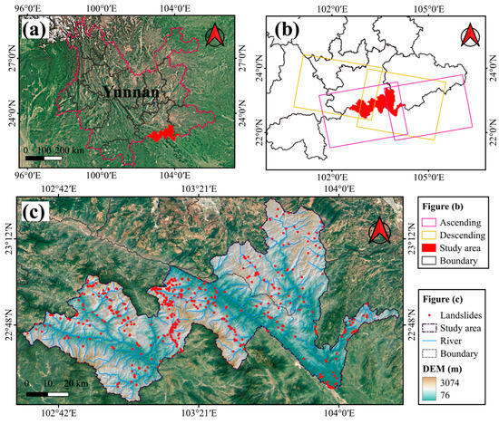 Geographical setting and spatial extent of the research area: (a) location of the study area in Yunnan Province, China; (b) coverage of Sentinel-1 satellite imagery; (c) geographic scope of the study region and distribution of recorded landslides.