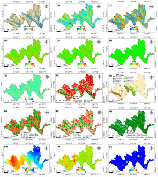 Thematic map of LCFs. (a) Elevation; (b) slope; (c) aspect; (d) PLC; (e) PRC; (f) TWI; (g) SPI; (h) DTFA; (i) lithology; (j) DTRI; (k) DTRO; (l) LULC; (m) precipitation; (n) NDVI; (o) POI kernel density.
