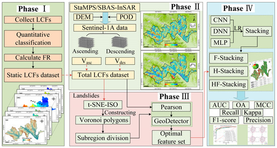 In this research, the landslide disaster warning demonstration area of Honghe Hani and Yi Autonomous Prefecture in Yunnan Province was selected as our research area. interferometric synthetic aperture radar (InSAR) technology was employed to acquire dynamic LCFs, which were combined with static factors to develop a comprehensive LSA system. Subsequently, the t-SNE-ISO algorithm was applied to delineate subregions within the study area, effectively minimizing the impact of spatial heterogeneity. Additionally, a feature selection strategy was implemented to choose the most effective set of factors, leading to the creation of a landslide susceptibility map (LSM) using the stacking ensemble algorithm.