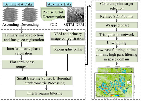 To address topographic phase distortion, this study utilizes a digital elevation model (DEM) with a 30 m spatial resolution, sourced from the Shuttle Radar Topography Mission (SRTM) and made publicly available by NASA. Additionally, precise orbit determination (POD) information released by the ESA is used to correct systematic errors in the interferometric baselines. The complete StaMPS/SBAS-InSAR processing workflow is summarized in Figure 4.
