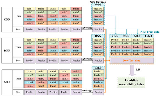 Stacking is a hierarchical ensemble learning strategy that combines the outputs of multiple base learners as input features for a higher-level meta-model, which produces the final prediction results. This approach has the potential to improve predictive performance, mitigate overfitting, and increase the model’s robustness in processing complex data [60]. The specific framework is illustrated in Figure 7. In this research, CNN, DNN, and MLP are selected as the base models, and the dataset is partitioned into five segments using a five-fold cross-validation approach. Four segments function as the training sets for the base models, while the rest of the segments are used as the cross-validation set. The prediction outputs of the base models are further aggregated as new landslide-related features, which are then fed into a logistic regression (LR) model serving as the meta-learner to generate the final prediction. Owing to its simple structure, low variance, and strong generalization ability, LR has been widely employed in stacking architectures to effectively integrate base learners’ outputs and reduce the risk of overfitting [61].