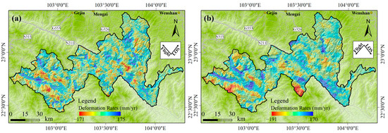 Average annual deformation rates in the research area: (a) ascending deformation; (b) descending deformation.