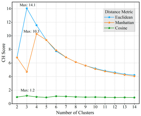 To determine the optimal distance metric and number of clusters for the ISO clustering algorithm, this study evaluated the CH index under three distance measures: Euclidean, Manhattan, and cosine. The variation of CH scores with different cluster numbers is shown in Figure 9. As illustrated, the clustering performance was highest under the Euclidean distance, where the CH index peaked at 14.1 when the number of clusters was three. This indicates that Euclidean distance provides the greatest inter-cluster separability and intra-cluster compactness. The Manhattan distance ranked second, with a CH value of 10.3 when the number of clusters was four. In contrast, clustering performance under the cosine distance was significantly weaker, with a maximum CH value of only 1.2. Based on these comparisons, Euclidean distance was deemed most suitable for capturing the distribution characteristics of landslide samples in the t-SNE-reduced space, effectively distinguishing their differences in the LCFs attribute domain. Consequently, Euclidean distance was selected as the final distance metric, and the t-SNE-reduced landslide samples were clustered into three categories using the ISO clustering algorithm. The resulting SHP is presented in Figure 10, which clearly identifies three spatially heterogeneous subregions within the study area.