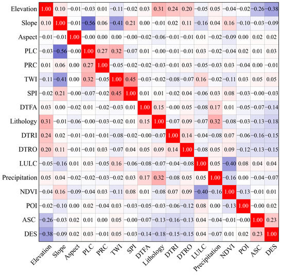 Figure 11 presents the Pearson correlation coefficients for the global LCFs. In the figure, red denotes a positive correlation, while blue signifies a negative correlation. The intensity of the colors corresponds to the strength of the correlations. The results indicate that the r-value between PLC and slope is −0.56, while the r-value between TWI and SPI is 0.45, both exceeding the threshold of 0.45. Notably, the correlation between TWI and slope reaches −0.41, suggesting a linear relationship. Consequently, this study excludes TWI and PLC from further analysis.
