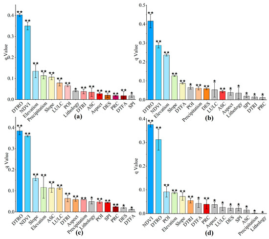 GeoDetector factor detection results. (a) Factor detector results for the entire study area; (b) factor detector results for subregion I; (c) factor detector results for subregion II; (d) factor detector results for subregion III. Note: A p-value below 0.05 is considered “significant” and is indicated with ★★, whereas a p-value that equals or exceeds 0.05 is deemed “not significant” and is represented with ★.