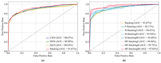 In classification evaluation, the following notations are used: TP (true positives) refers to landslide instances correctly classified; TN (true negatives) denotes non-landslides correctly predicted; FP (false positives) corresponds to non-landslides misclassified as landslides; and FN (false negatives) indicates landslides that were incorrectly predicted as non-landslides. Metrics with values closer to 1 typically reflect stronger predictive performance. Among them, AUC is a key indicator widely used to assess the effectiveness of binary classification models. It is defined as the area under the receiver operating characteristic (ROC) curve plotted in a two-dimensional coordinate system, bounded by the curve and the coordinate axes. An AUC value approaching 1 signifies that the model possesses excellent discriminative ability [62]. In contrast, an AUC near 0.5 reflects limited discriminative power, implying that the model performs no better than random guessing in separating positive and negative samples.