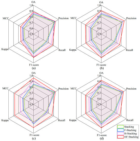 - The F-stacking model significantly outperforms the traditional stacking model, with improvements of 1.62% in OA, 1.63% in precision, 1.57% in recall, and 1.65% in F1 score. Additionally, the kappa coefficient and MCC increased by 3.20% and 3.15%, respectively. Furthermore, the HF-stacking model exhibited comprehensive improvements compared to the H-stacking model, with all EMs significantly enhanced;