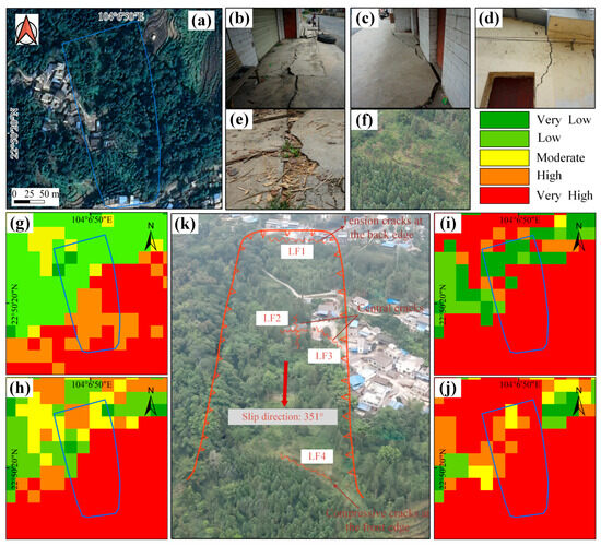 Analysis of model prediction results for typical landslide areas based on field investigation. (a) Interpretation map of landslide areas derived from Google satellite imagery; (b,c) field photographs of LF1; (d–f) field photographs of LF2, LF3, and LF4, respectively; (g–j) detailed views of the LSMs generated by the stacking, F-stacking, H-stacking, and HF-stacking models, respectively; (k) UAV photograph.