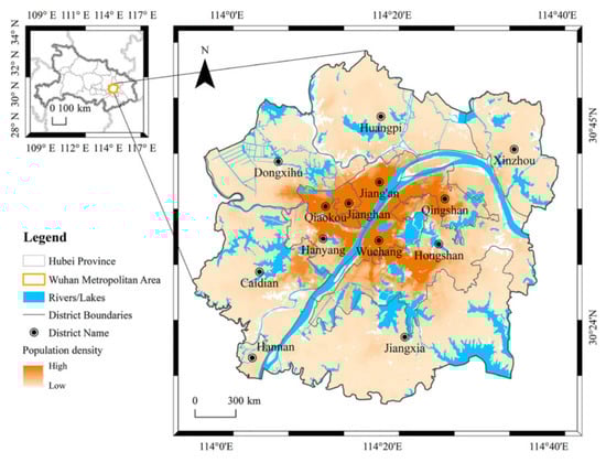 Wuhan is one of the largest metropolises in China, the core of the Yangtze River Economic Belt and the capital of Hubei Province. The Wuhan Metropolitan Area specified in the Wuhan City Master Planning (2010–2020) was selected as the study area [11]. The Wuhan Metropolitan Area refers to the main agglomeration of urban function and the expansion area of urban development, including the built-up areas and urban fringe [12] The study area includes all areas of Hanyang, Hongshan, Jiang’an, Jianghan, Qiaokou, Qingshan and Wuchang Districts and parts of Caidian, Dongxihu, Hannan, Huangpi, Jiangxia and Xinzhou Districts, covering an area of 4398.83 km2 (Figure 1).