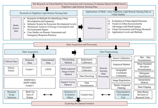 To systematically investigate the delineation and consistency evaluation of urban built-up areas using multi-source Nighttime Light Remote Sensing (NTL) data, a comprehensive research framework was established (Figure 2). The framework comprises four core modules: (1) theoretical foundations, (2) data acquisition and preprocessing, (3) methodological implementation, and (4) evaluation and optimization.