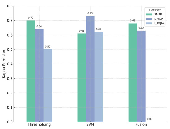 Among all combinations, the SNPP/VIIRS dataset generally achieved high accuracy [19,20], especially with the thresholding method (kappa = 0.70) and fusion method (kappa = 0.68). The DMSP/OLS dataset performed best with the SVM method (kappa = 0.73), outperforming SNPP and Luojia-1 under the same method.