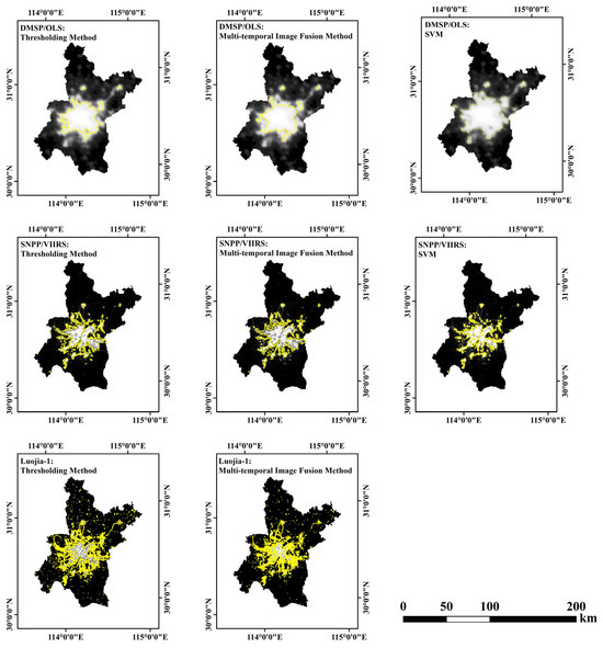 Figure 4 presents the spatial delineation results generated using three methods—thresholding, multi-temporal image fusion, and support vector machine (SVM)—applied to three NTL datasets: DMSP/OLS, SNPP/VIIRS, and Luojia-1.