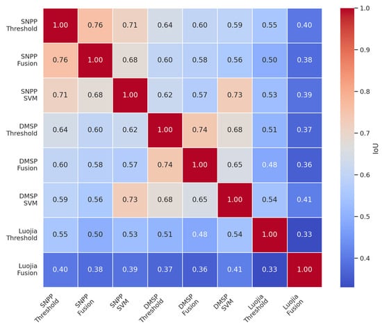 To assess the spatial agreement of urban built-up area delineation results across different methods and nighttime lights (NTL) datasets, we conducted a consistency analysis using overlay-based spatial overlap metrics. Specifically, we calculated the intersection over union (IoU) between binary delineation masks from various method–dataset pairs [22]. This metric measures the proportion of spatial overlap relative to the union of built-up regions, thereby quantifying spatial agreement. The IoU analysis revealed that the following facts: (1) The highest spatial consistency was observed between SNPP/VIIRS-thresholding and SNPP/VIIRS-fusion, with an average IoU of 0.76, indicating high internal agreement within the same dataset. (2) Cross-dataset comparison (e.g., SNPP vs. DMSP, SNPP vs. Luojia-1) showed moderate consistency, with IoU values ranging from 0.52 to 0.64, depending on the method used. This suggests that dataset characteristics (e.g., radiometric sensitivity/dynamic range and spatial resolution) substantially influence delineation similarity. (3) The lowest agreement was observed between Luojia-1-fusion and other methods/datasets (average IoU < 0.40), likely due to the brightness accumulation, noise amplification, and overestimation introduced by temporal compositing of Luojia-1 imagery (Figure 5).