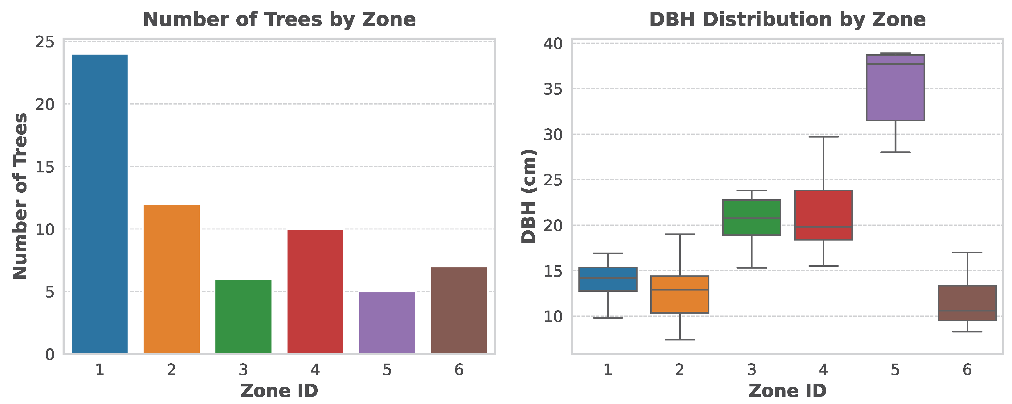 | Zone | Count | DBH (cm) | Perimeter (cm) | |||||||