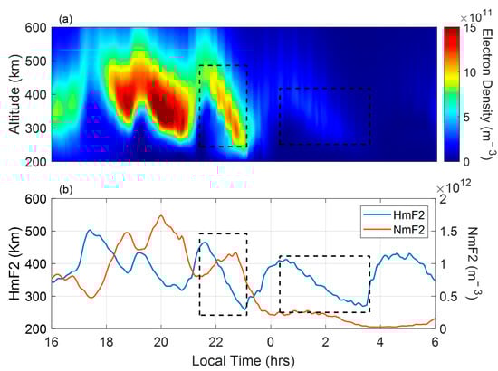 Figure 1 illustrates the height–time variations in electron density, along with temporal changes in peak electron density (NmF2) and HmF2, from 16 to 17 August 2011.