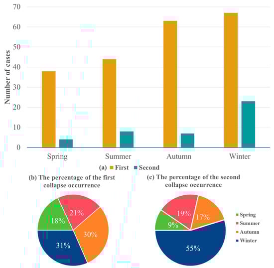 Figure 2, there were 38 midnight collapses in spring (18% of all midnight collapses), 44 in summer (21%), 63 in autumn (30%), and 67 in winter (31%). Similarly, the distribution of second midnight collapses was as follows: 4 in spring (9% of all second collapses), 8 in summer (19%), 7 in autumn (17%), and 23 in winter (55%). These results indicate that while midnight collapses were relatively evenly distributed across seasons, second collapses occurred most frequently in winter.