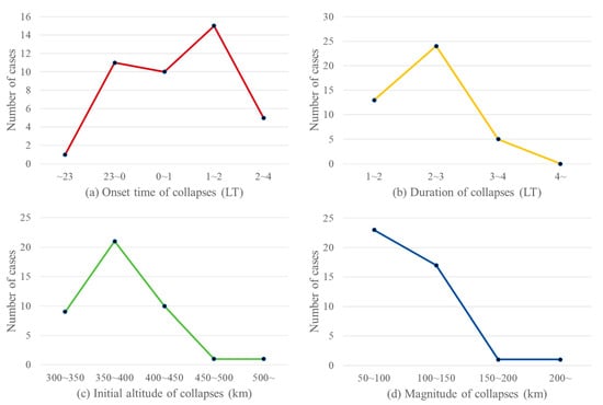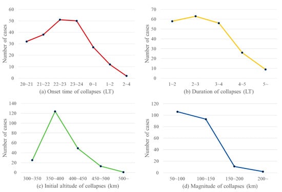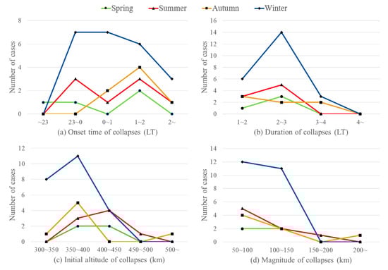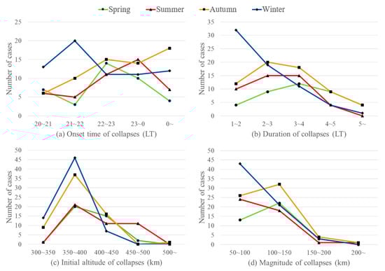 In winter, 67 midnight collapses were recorded across 69 nights. The onset time was concentrated before 22:00 LT, with 33 collapses occurring between 20:00 and 22:00 LT. Collapse durations were generally shorter than those in other seasons, typically lasting 1 to 2 h. No collapse was observed with an initial altitude above 450 km. The magnitude distribution was similar to that of summer, with 43 collapses falling within the 50 to 100 km range, followed by 21 collapses within the 100 to 150 km range.