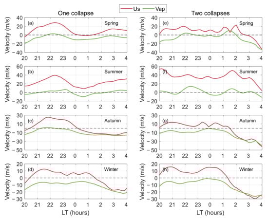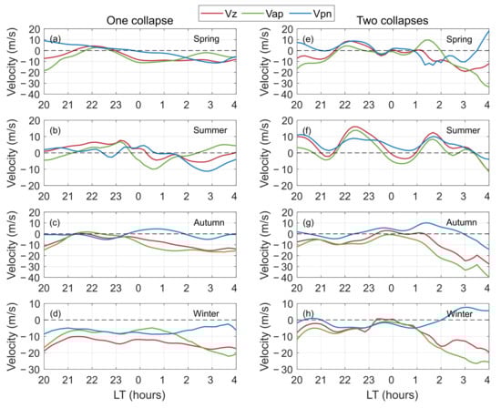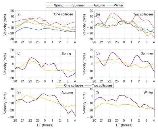 shows more fluctuations, and the rapid decrease starts later. In spring and summer, the decrease begins around 02:00 LT; in spring, reversal occurs at ~02:30 LT, while in summer, no reversal is observed (similar to single-collapse nights). In autumn,