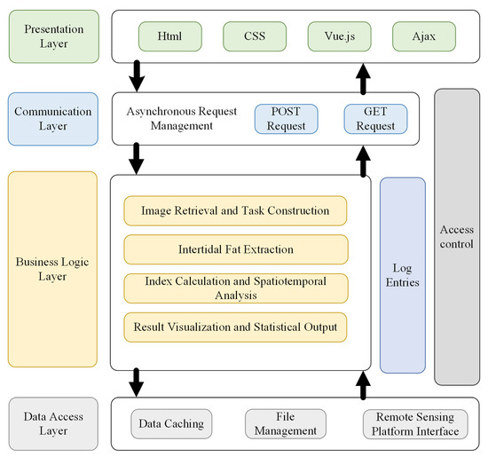 The system architecture adopts a conventional front-end/back-end separation design, organized into four primary layers (Figure 2): the Presentation Layer, Application Layer, Business Logic Layer, and Data Access Layer. This layered architecture enables the complete web-based execution of coastal tidal flat extraction and visualization processes at national scales through standard browser interfaces.