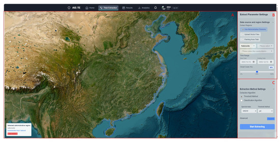 User interface for tidal flat extraction task configuration ((A) Map view; (B) ROI selection; (C) Algorithm parameters).