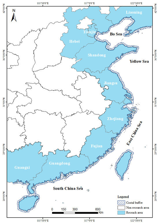 Study areas covering 14 coastal provinces in China (5 km landward and 15 km seaward buffers from the coastline).
