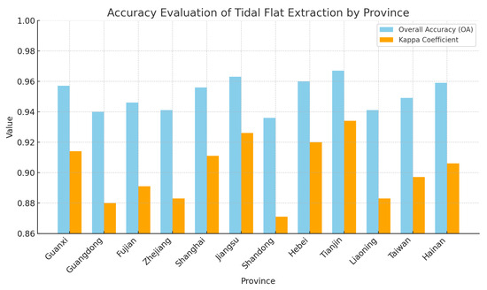 Overall Accuracy (OA) and Kappa coefficients of tidal flat extraction across China’s coastal provinces.