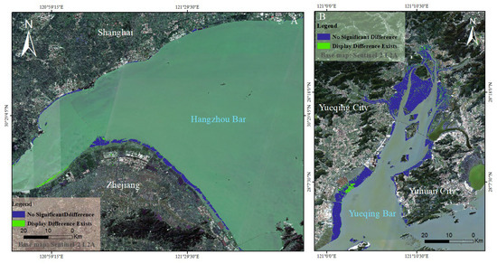 Spatial distribution of classification differences between the thresholding method and the Random Forest classification for Hangzhou Bay (A) and Yueqing Bay (B).