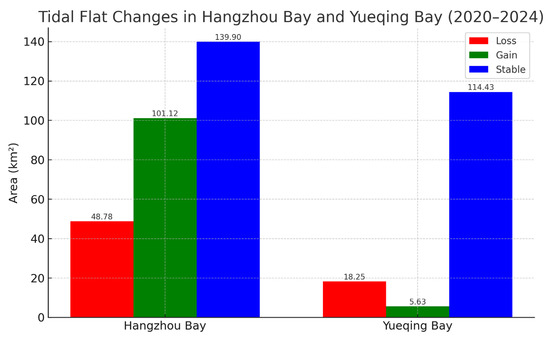 Statistical comparison of tidal flat changes (stable, gain, and loss) in Hangzhou Bay and Yueqing Bay between 2020–2024.