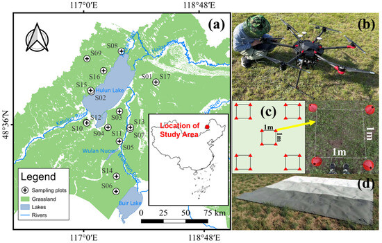 The study area was located in the grassland region of the Hulun Lake Basin (Figure 1), covering a total area of 150,000 km2, with a climate characterized as temperate continental monsoon. The average annual temperature is 0.83 °C, and the average annual precipitation ranges from 200 to 300 mm. Ground survey and data collection were conducted from 25 July to 1 August 2022, and from 19 July to 30 July 2023, when the grassland growth in the Hulun Lake Basin is at its peak and can best reflect the typical LAI of the grassland. A total of 17 plots with a size of 100 m × 100 m were set up within the study area. Within each plot, five 1 m × 1 m quadrats were established using the five-point method, bounded by red cones and white nylon lines. The main dominant grass species in study area included Carex duriuscula, Allium ramosum, Potentilla bifurca, and Artemisia adamsi, etc.