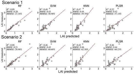 Random forest (RF), support vector machine (SVM), K-nearest neighbor (KNN), and partial least squares regression (PLSR) techniques were used to model two scenarios, one based on original spectra and transformations (Scenario 1), and the other based on hyperspectral vegetation indices (Scenario 2), the results were shown in Figure 4. Random forest (RF) consistently and significantly outperformed other models across both scenarios (testing R2 = 0.88–0.89, RMSE = 0.20–0.21, RRMSE ≈ 27–29%), with a slightly better R2, RMSE, and RRMSE in Scenario 1. SVM, KNN, and PLSR exhibited comparable performance with R2, RMSE, and RRMSE values ranging from 0.42 to 0.52, 0.42 to 0.46, and 57% to 63%, respectively. These three models all performed marginally better in Scenario 1 than in Scenario 2.