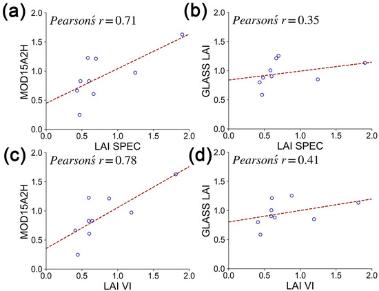 A validation was made to address the relationship between the LAI predicted in this study and a widely recognized LAI product (Figure 5). The average LAI of the whole plot (~100 m × 100 m) was generated using RF models in both scenarios to spatially match two LAI products, namely MODIS LAI (MOD15A2H) and GLASS LAI. LAI-VI consistently performed better than LAI-SPEC in correlating with both products, achieving Pearson’s r values of 0.78 (vs. MOD15A2H, Figure 5c) and 0.41 (vs. GLASS, Figure 5d), compared to LAI-SPEC’s Pearson’s r values of 0.71 (MOD15A2H, Figure 5a) and 0.35 (GLASS, Figure 5b). Moreover, both models exhibited stronger correlations with MOD15A2H than with GLASS LAI, underscoring MOD15A2H’s superior alignment with our predictions.