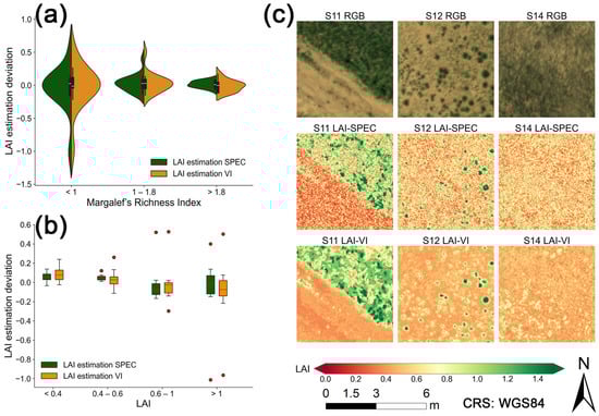 (a) Absolute LAI estimation deviation in different species richness samples; (b) absolute LAI estimation deviation in different measured LAI samples; (c) spatial distribution of LAI modeling results in the sample plots. From top to bottom are RGB composite image, LAI mapping visualization using the random forest model in Scenario 1, and LAI mapping visualization using the random forest model in Scenario 2.
