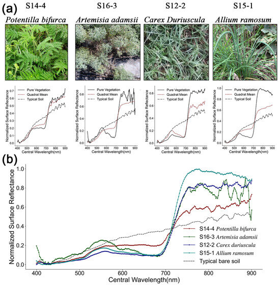 Quadrat level spectrum response curves. (a) Spectral response curves of typical dominant species and bare soil, and pictures of grass species; (b) spectral response curves of pure vegetation, sample average, and typical bare soil within a single dominant species quadrat.