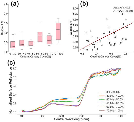 Relationship between quadrat canopy cover and LAI. (a,b) Relationship between quadrats’ total canopy cover and LAI; (c) spectral response curves (normalized) for different quadrat canopy cover levels; the dashed red squares represent region where the canopy cover shows differences.