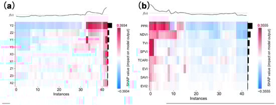 Schematic diagram of SHAP values for each feature. (a) Scenario 1; (b) Scenario 2. Black line above represents the LAI value output by the model, the black bar on the right shows the absolute size of the SHAP values for each feature, and the central heat map illustrates the SHAP values of different features under a single input.