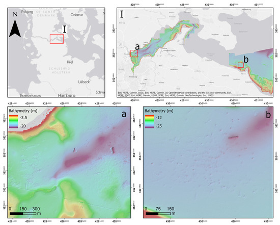 Study area map of Flensburg Fjord (with inset (I) showing the zoomed extent), highlighting the training area (a) and validation area (b).