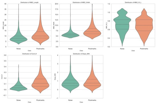 In the training dataset, pockmarks exhibited particularly distinct morphometric traits. They had a larger mean area (46.44 m2), greater relief (mean: 0.58 m), and steeper slopes (Slope_MAX: 8.12°) compared to noise features (Area: 19.22 m2; Relief: 0.20 m; Slope_MAX: 5.30°). Width-to-length ratios and circularity metrics further highlighted these differences. Pockmarks showed a more symmetrical shape (MBG_W_L: 0.68; Circularity: 0.62), whereas noise features tended to be more irregular (MBG_W_L: 0.75; Circularity: 0.71). Notably, confined relief (Conf_R) was also higher in pockmarks (0.05) than in noise (0.01), reinforcing their relative depth and distinct geometry.