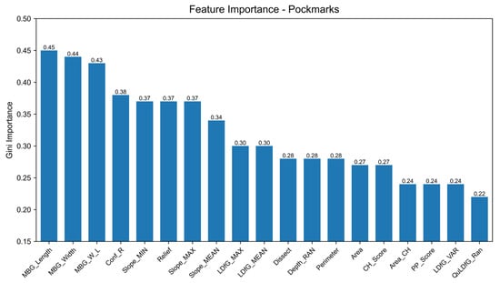 Bar chart displaying the Gini importance scores of key parameters from the Random Forest (RF) analysis for pockmark classification.