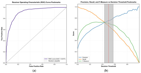 (a) Receiver operating characteristic (ROC) curve for the pockmark classification model, showing the trade-off between the true positive rate (sensitivity) and false positive rate (1-specificity). The model achieves an area under the curve (AUC) of 0.917, indicating strong discriminative performance. The dashed line represents a random classifier (AUC = 0.5) for reference. (b) Precision, recall, and F-measure plotted against decision threshold for the pockmark classification model, indicating an optimized threshold between 0.43 and 0.57 (0.5 has been selected).