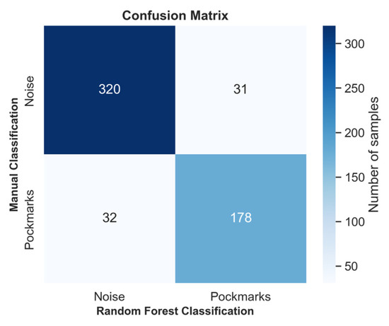 The performance of the supervised classification for pockmark delineation was evaluated in the validation area, revealing strong and balanced predictive capability, as shown in Table 2. The classification of the noise class achieved a precision of 0.91, recall of 0.91, and specificity of 0.85, resulting in an F1-score of 0.91. Similarly, the pockmark class yielded a precision of 0.85, recall of 0.85, and specificity of 0.91, with an F1-score of 0.85. The overall classification accuracy was 89%, with a balanced accuracy of 88% and a Cohen’s Kappa of 0.76, indicating substantial agreement between the predicted and manual labels. These outcomes are further illustrated in Figure 8, which depicts the spatial distribution of the classification results in the validation area.