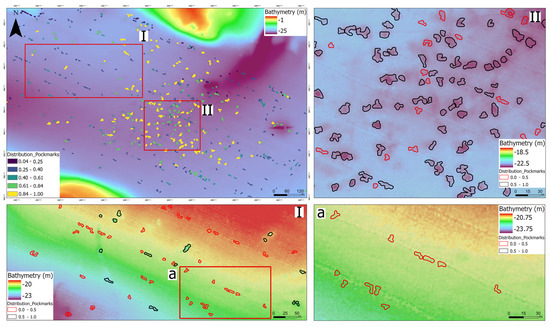 Validation area showing the spatial distribution of predicted pockmarks and noise. Upper left: full validation area with the model classification, where 0 represents noise and 1 represents pockmarks. Detail Area (I): magnified view of selected pockmarks using a classification threshold of 0.5. Detail Area (II): magnified view highlighting both pockmarks and potential nadir-related artifacts, also using a 0.5 threshold. Detail (a): close-up showing linear features consistent with nadir artifacts along MBES tracklines.
