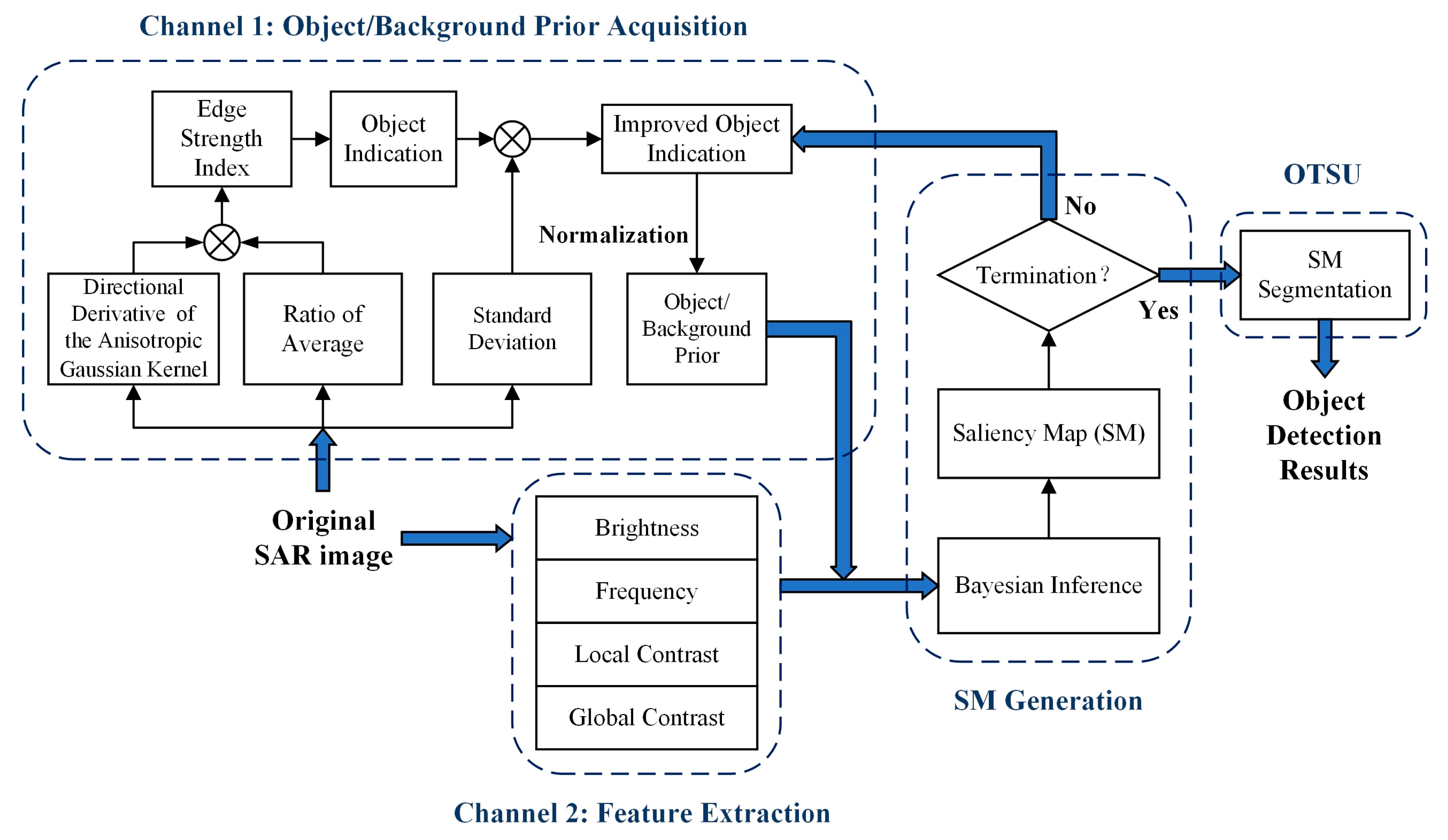 Integrating the prior calculation and the SM modification, this paper proposes a two-channel Bayesian framework with adaptive iteration for salient object detection in single SAR imagery. The main contributions of this work are summarized as follows: