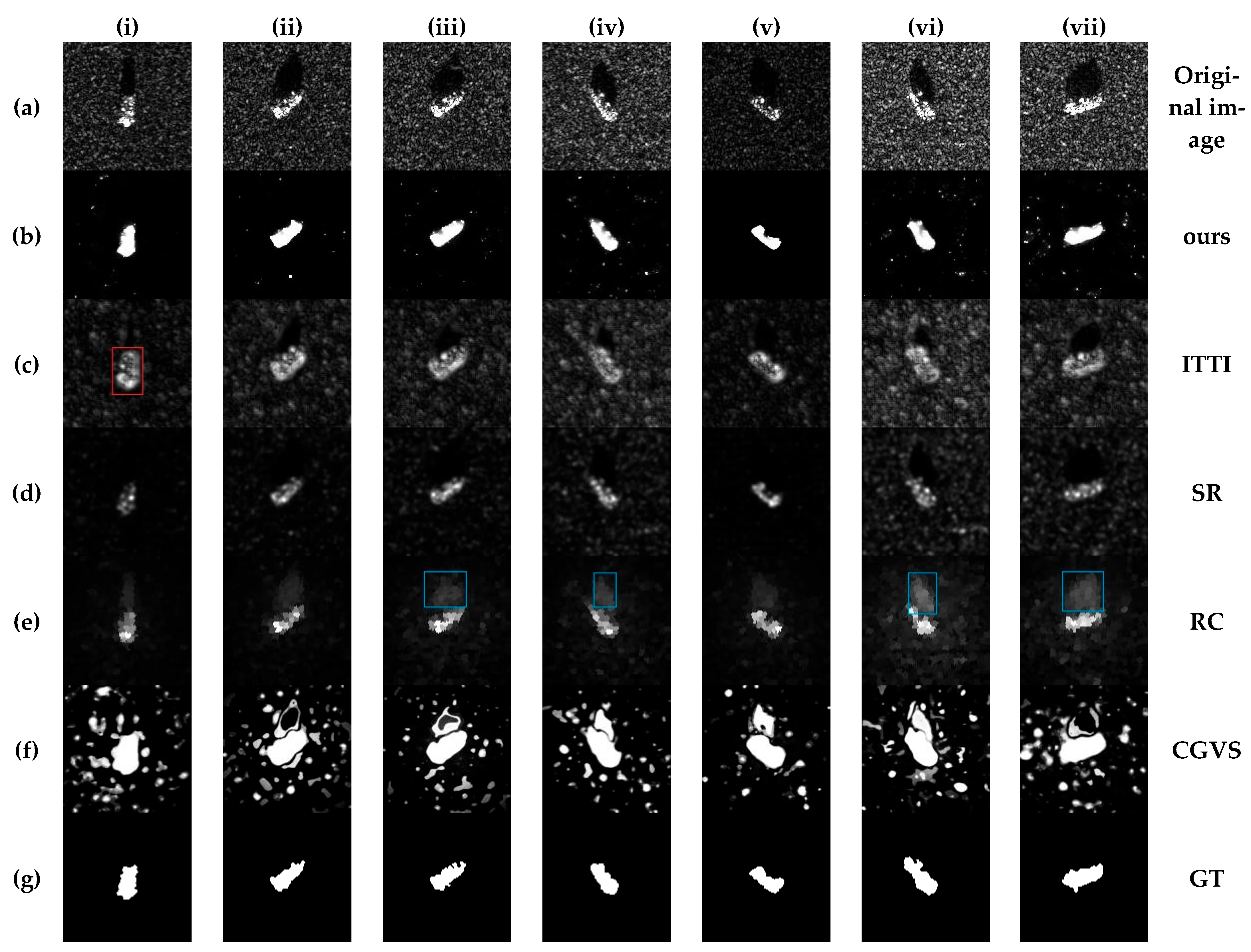 Figure 7e(vi); (2) owing to utilizing a global contrast mechanism, shadow areas—which typically exhibit lower grayscale levels than both background clutter and objects—are often assigned elevated saliency values, as indicated by the blue-boxed areas in