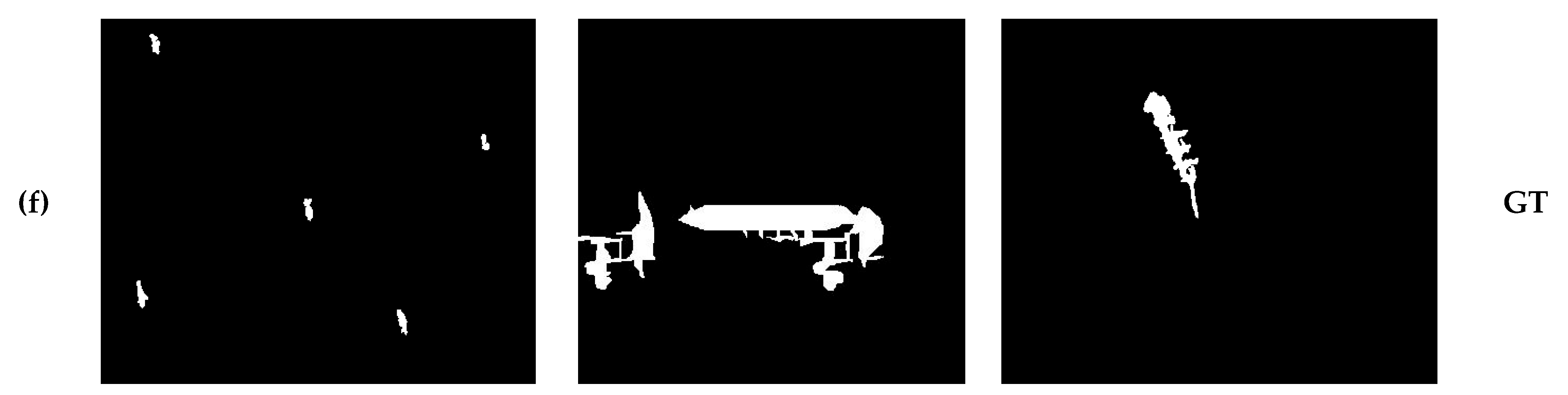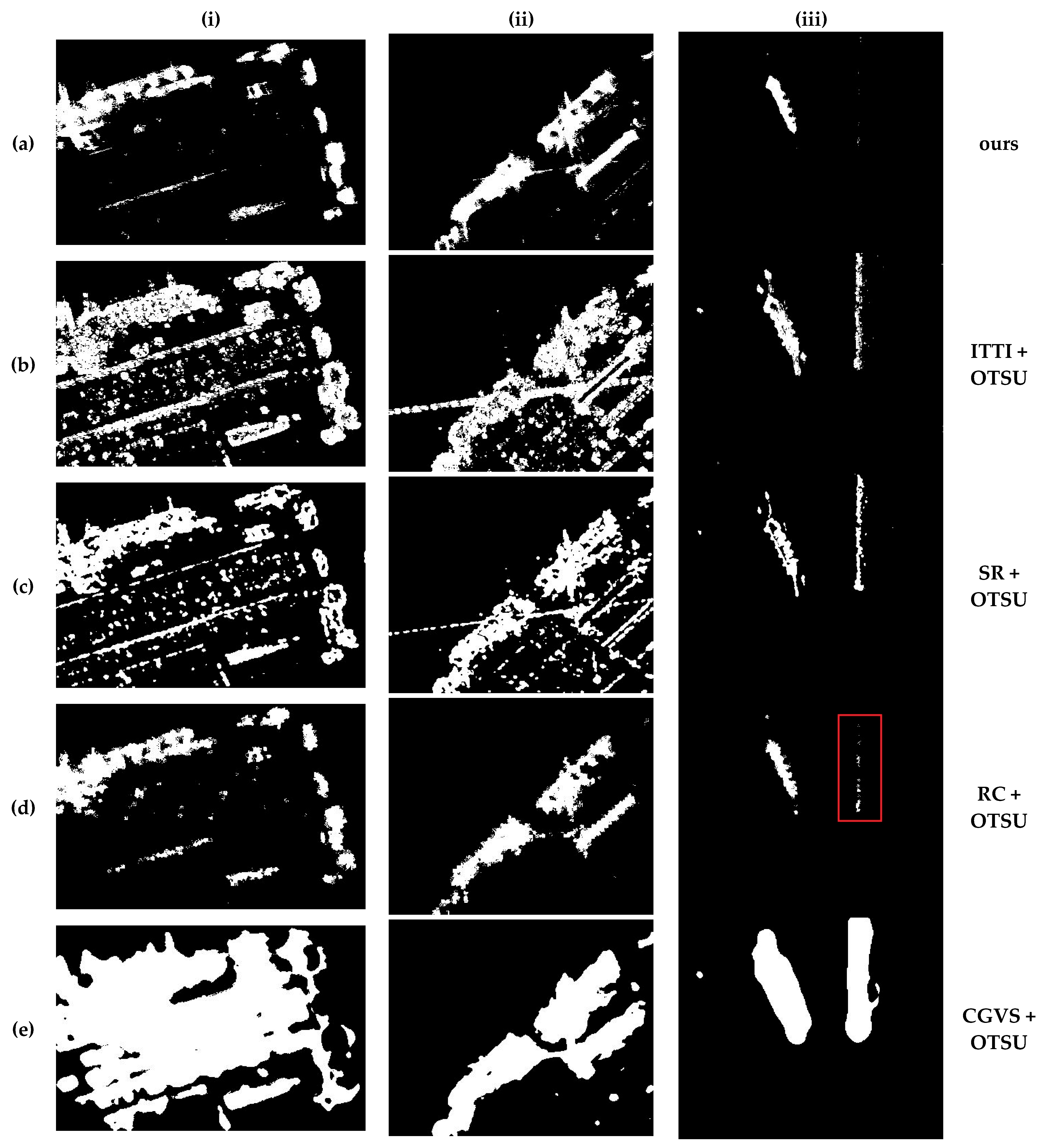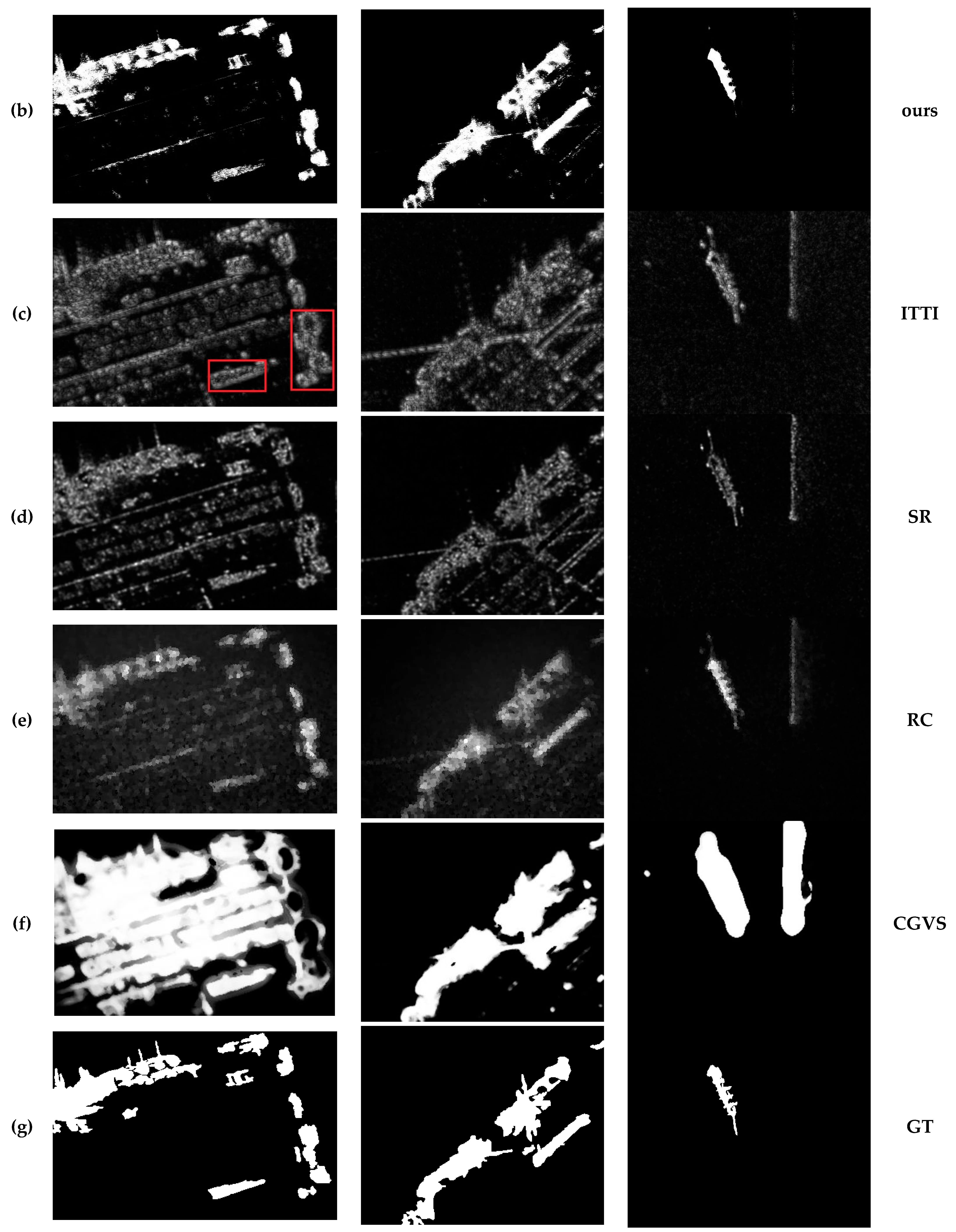 Figure 10a–e sequentially display segmentation examples based on the proposed SMs, ITTI SMs, SR SMs, RC SMs, and CGVS SMs. Experimental observations indicate that while CGVS SMs exhibit favorable binary property with high correspondence between segmentation results and regions of high saliency values, they simultaneously activate extensive non-object areas, leading to severe false alarms that render CGVS ineffective in this scenario. ITTI and SR SMs achieve better segmentation quality, with results largely covering object regions and much fewer false alarms than CGVS + OTSU. However, residual false alarms persisting in