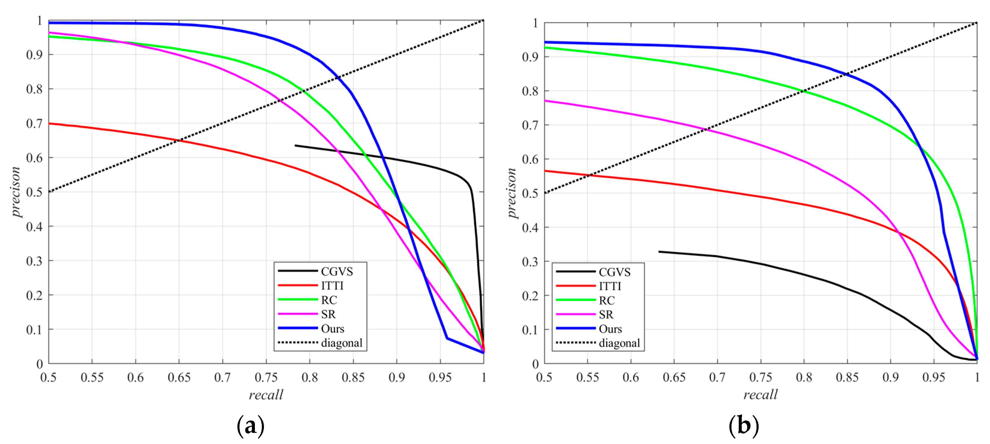 Figure 7e. These shortcomings may adversely affect subsequent salient object extraction. The CGVS model can assign high saliency values to object areas, and there is a clear distinction between regions with high and low saliency values in its SM. However, it simultaneously enhances numerous background regions and presents a more pronounced shadow enhancement effect. As shown in