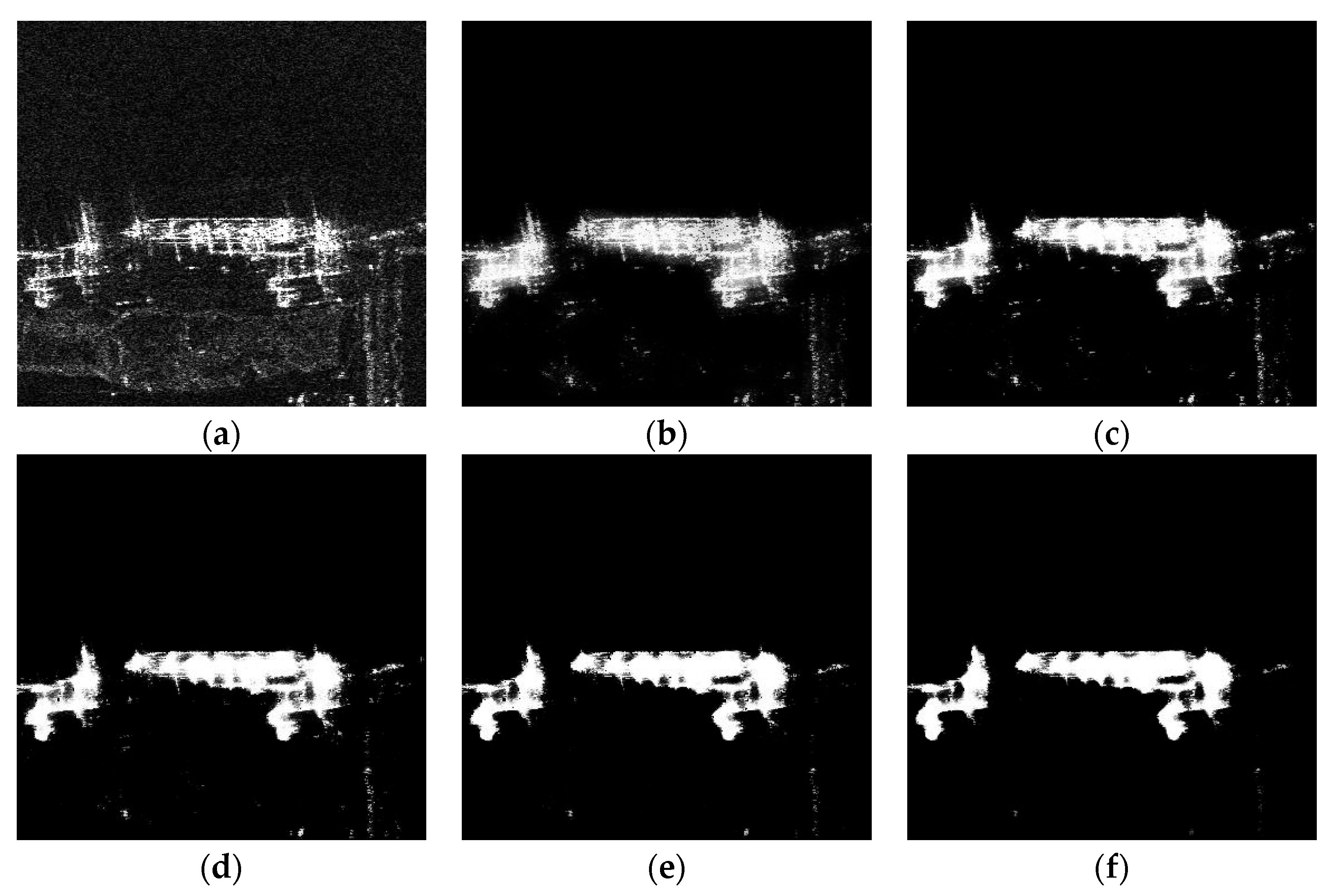 Figure 11f), there is a distinct difference between object areas and the background, allowing us to conduct segmentation with a simple global threshold. Therefore, the adaptive iteration mechanism can effectively improve the SM generated from a single round of Bayesian inference, and according to the analysis in