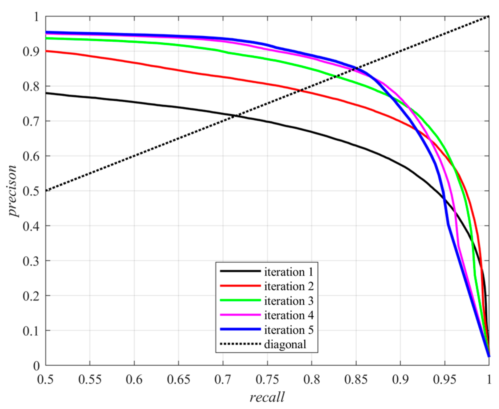 Figure 12. As the number of iterations increases, the P-R curves progressively shift towards the upper-right corner, quantitatively revealing the enhancement of SM performance through the iteration processing. On the other hand, the variation from